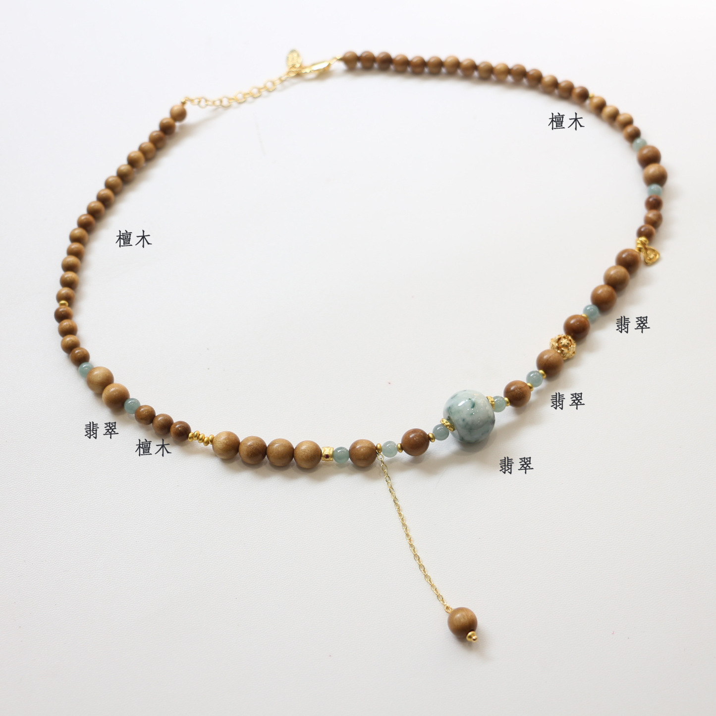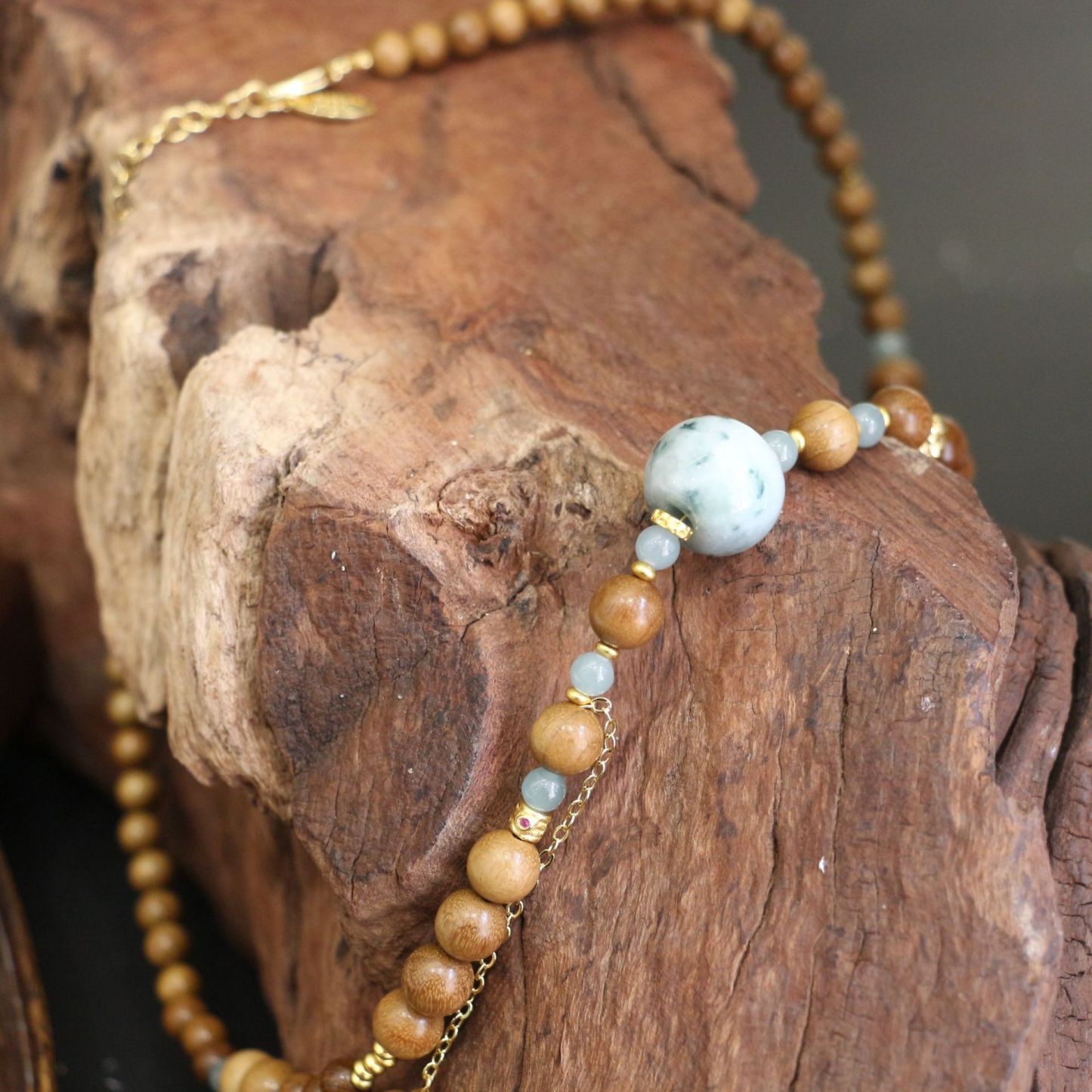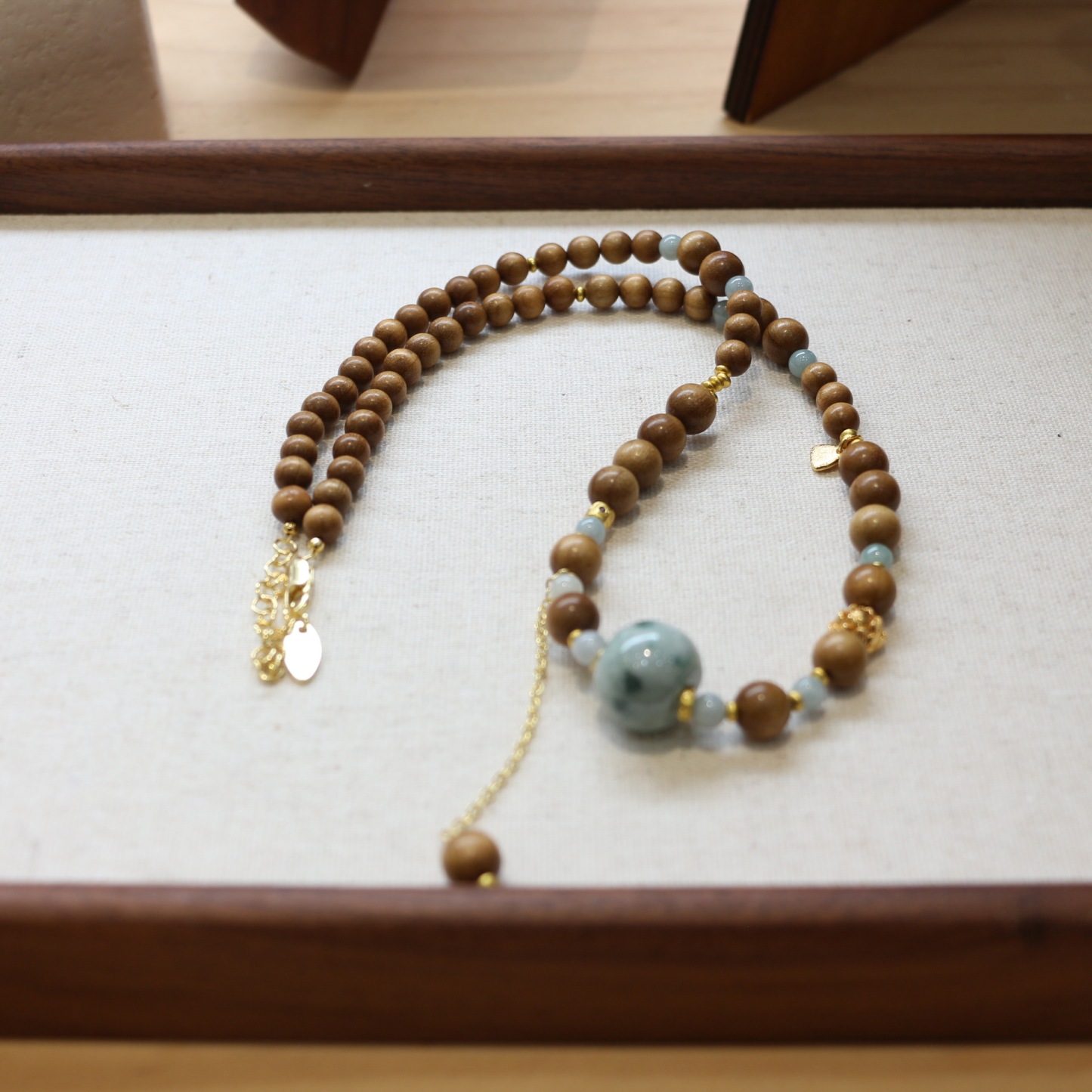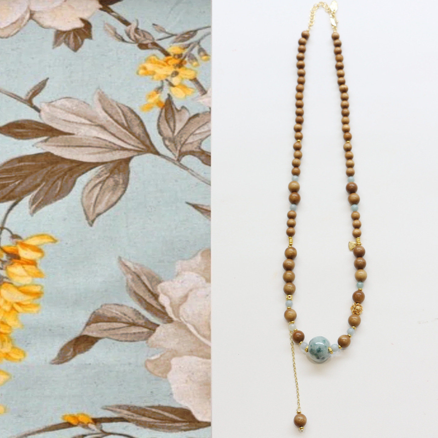 Wood Bead Jade Long Necklace Brown Green Layering Chain